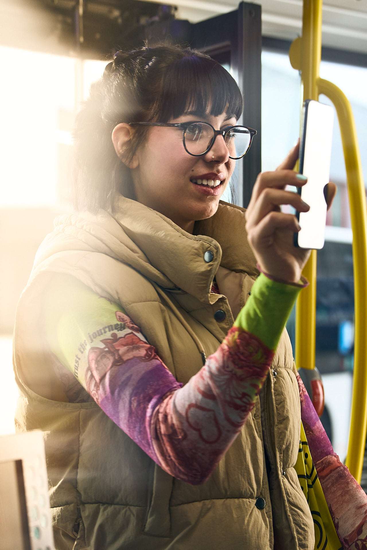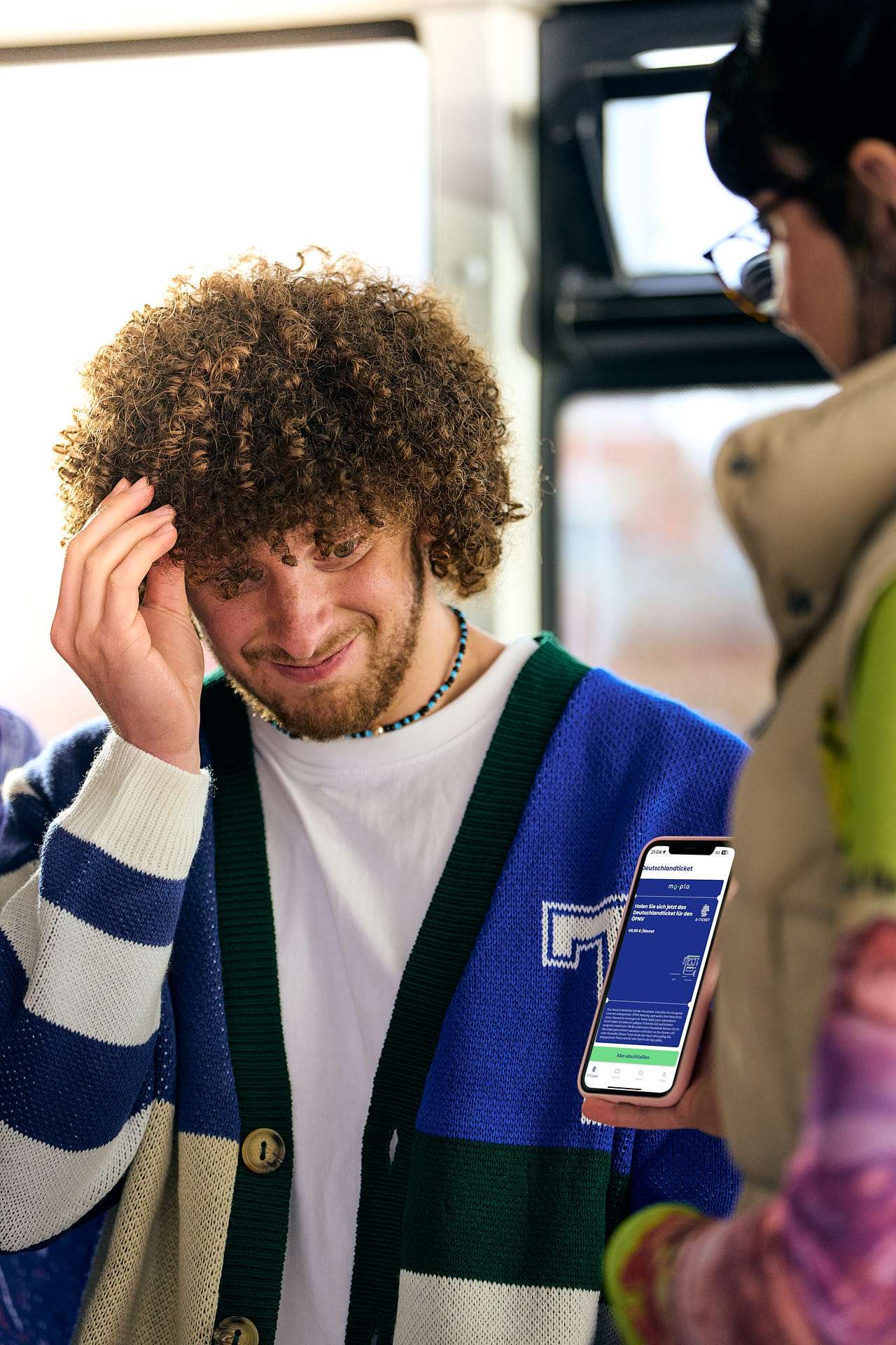 Die Bildwelt zeigt nicht nur App-Screens, sondern Situationen mit echten Menschen. Das macht ein technisch geprägtes Thema wie Ticket-App und ÖPNV spontaner und zugänglicher.